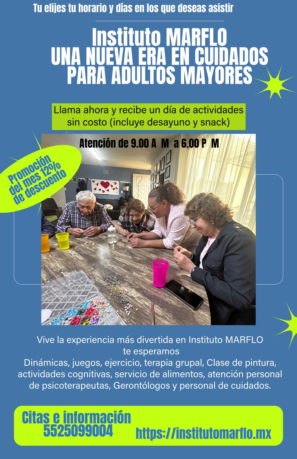 En Instituto Marflo las sorpresas alegres y de convivencia sana serán el marco de cada día, de esta forma la estancia, dentro las instalaciones darán la pauta para generar un desarrollo cognitivo y corporal de manera funcional, el equipo de trabajo estará atento y atendiendo cada necesidad del Adulto Mayor, en todo momento tendrán la oportuna atención médica de primer contacto y el acompañamiento del personal que estará a su servicio.